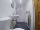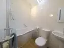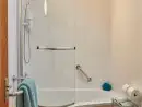 The bathroom has a bath with an electric shower, basin, toilet and heated towel rail.