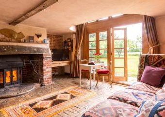 Part of the old Grove Farm; Dons Barn was originally the Winnowing Barn and dates back to the 1700’s. Downstairs you can relax in the massive Kilim covered Knoll sofa enjoying the many original features of this stylish and very cosy cottage, features like the original Suffolk brick floor and the old millstones that are now used as the table and the hearth for the roaring log burning stove. Upstairs the roof is open to the beams and there are lovely views over the orchard garden into the sunset through the oak and glass wall which covers this side of the barn.
