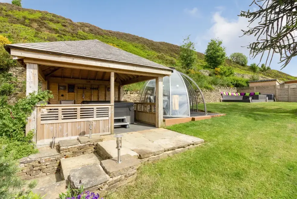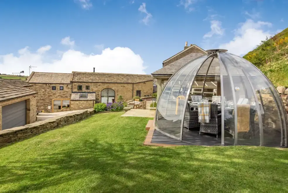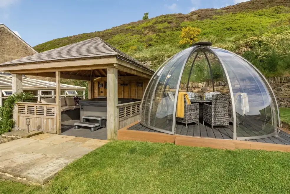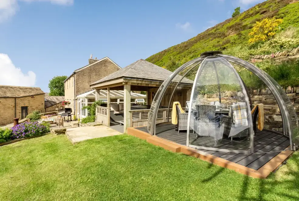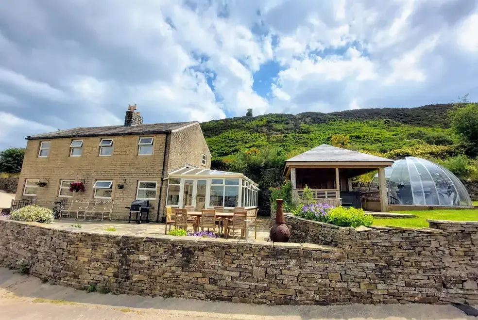 Upstairs at Long Ing Farm, guests will find three double bedrooms, including one with a four-poster bed and an en-suite shower room, a super king-size double with zip and link beds, and an additional double room along with an adult bunk room. The family bathroom offers a bathtub with a hand-held shower attachment. Outside, the sunny patio and a sweeping lawned garden provide breathtaking views of the surrounding green trees and farmland. The enclosed dining pod offers the opportunity to dine under the stars, no matter the season. This peaceful location is convenient for accessing Holmfirth, known from 'The Last of The Summer Wine', and offers a variety of dining and drinking establishments, as well as scenic walking paths in the Holme Valley.