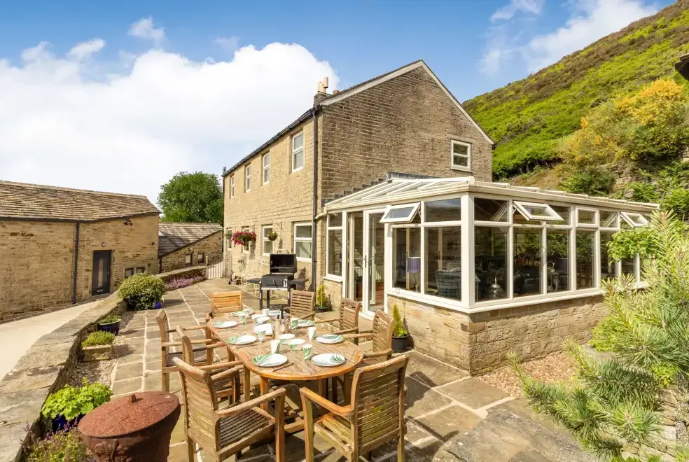 Long Ing Farm is proud to be the Sykes Gem Awards 2024 Bronze winner for Best Farm Stay. This stone-built detached cottage, located on a working farm at the edge of the Peak District National Park, is brimming with character, featuring exposed beams, open eaves, and traditional furnishings. The farmhouse kitchen is a culinary delight, equipped with a fabulous AGA range cooker, high-spec units, and sleek granite worktops. Relax by the woodburner in the lounge, perfect for cosy family gatherings. The large, plush sofas offer comfort after exploring the National Park's many walking paths. The conservatory connects the interior with outdoor spaces, ideal for quiet reading or enjoying the countryside views. The dining table in this room is perfect for family meals.