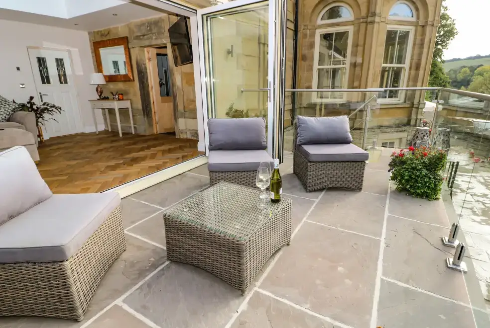 Take family and friends to Hipperholme in West Yorkshire, about midway between the Yorkshire Dales and the Peak District national parks. Book a week or two at Belvedere Farm, and escape to this handsome classical stone mansion that stands in ten acres of grounds and woodland. This magnificent 6 bedroom building has accommodation over four levels and during the summer, doors are flung open to the terrace and balcony.On arrival, cross the paved terrace edged with tubs of flowers. Garden furniture is dotted about the terrace and a hot tub stands at one side with a promise of a few relaxing dips. The presence of a gas barbecue would inspire outdoor lunches and garden parties.