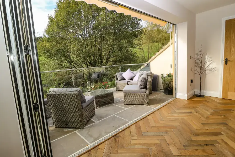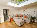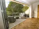 - On the first floor, step through to a light-filled orangery with parquet flooring and vaulted window in the ceiling. A plush recliner suite invitingly beckons in the corner. Doors open out onto the balcony where rattan furniture awaits sun seekers.