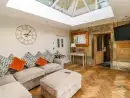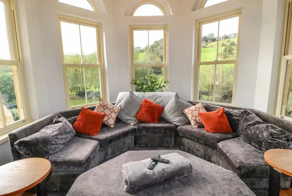 - Find another impressive sociable living area, a spacious sitting room with plush modular seating built into the curve of a bay window at one end of the hall. Relax after meals, check your email and messages or rest and chat with friends. A snug with a television and a log burner leads off of the hallway – yet another quiet public room. This holiday home offers plenty of space for a large group to spread out.