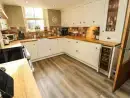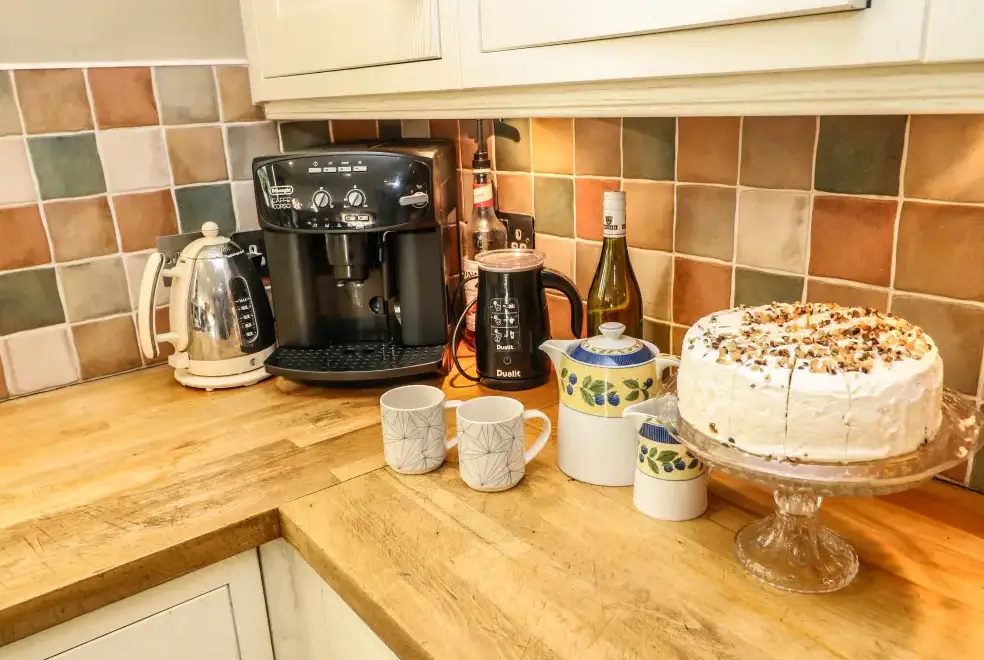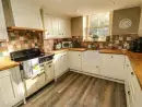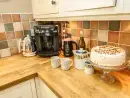 - Go through to the kitchen. The attractive country-style kitchen has plenty of white units and a butler sink. An impressive electric range cooker with a ceramic hob is where the action in the kitchen will centre on. Cooking utensils and crockery are stored in the cupboards, ready for your culinary masterpieces or big British fry ups. Put your food, wine and beer away in the American-style fridge/freezer and put the kettle on to make tea or coffee. The kitchen is pleasingly equipped with a dishwasher that will keep any dirty dishes out of sight, and the ubiquitous 4-slice toaster, microwave, washing machine and tumble dryer. A door leads to the dining room,