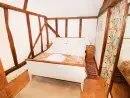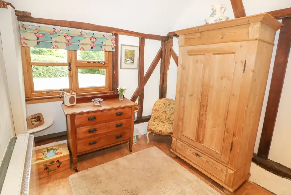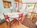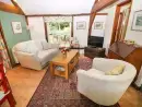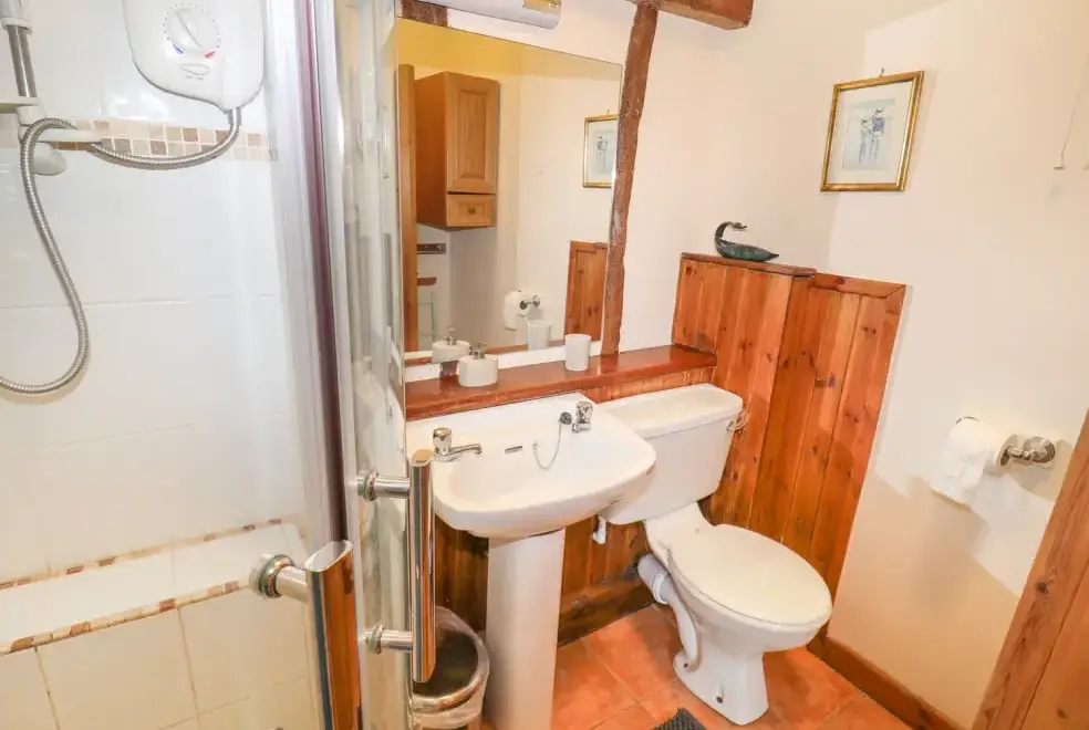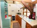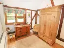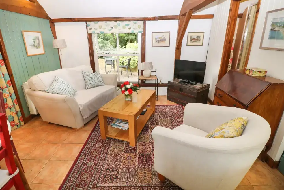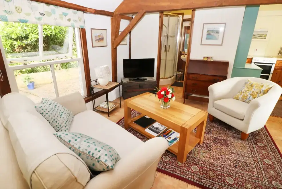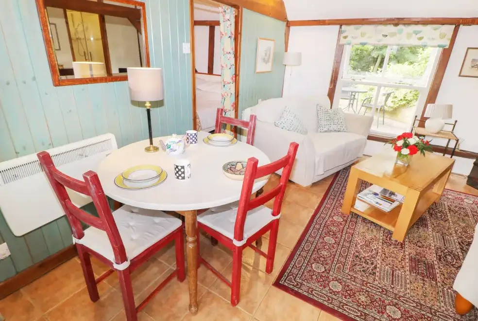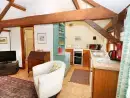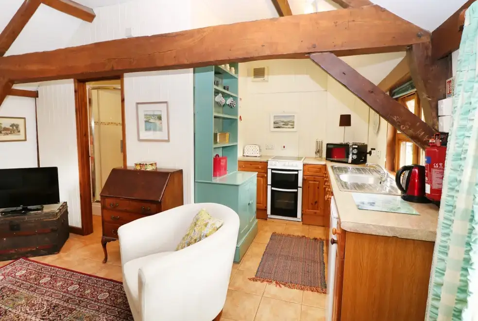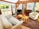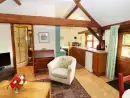 This single-storey, timber-clad detached barn conversion is one of two on-site properties, offering a superb romantic retreat for couples. The characterful open-plan living area is adorned with exposed beams and features a charming sitting and dining area that leads into a compact yet well-equipped kitchen. The beamed king bedroom is conveniently located off the living area, and the accommodation is completed by a shower room. At the rear, guests will find a private patio overlooking a shared lawned area, providing a tranquil spot to unwind and plan the day's adventures.