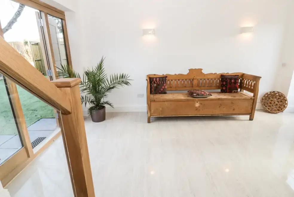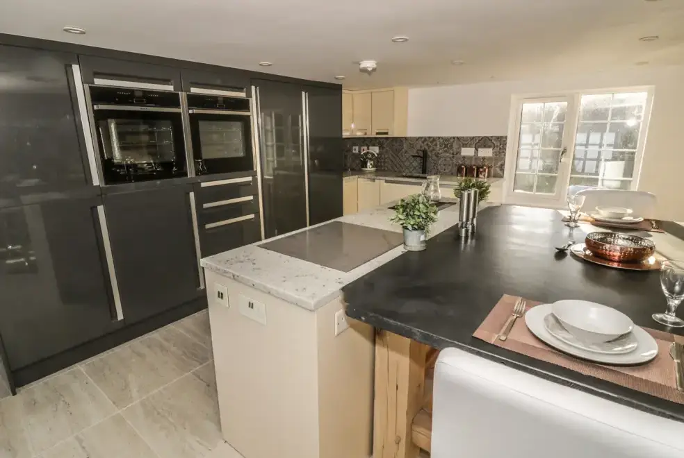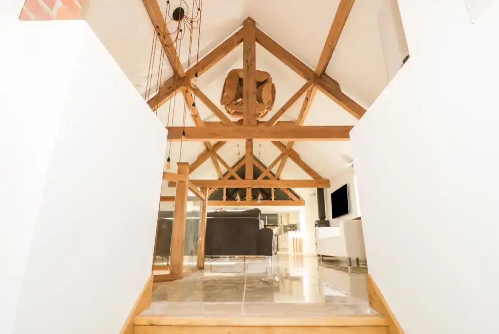 Step inside Lower Tundridge Farm to discover a beautifully designed open plan living area, complete with a fully equipped kitchen, a dining space, and a cosy sitting area with a woodburning stove. The farmhouse's contemporary design incorporates original features, such as exposed oak beams, offering a charming and characterful atmosphere. Guests will appreciate the high-quality facilities, including a luxury kitchen with three ovens, granite worktops, and a slate breakfast bar. The unique mezzanine area provides a tranquil retreat with views over the living space, perfect for relaxing with a book or enjoying quiet moments.