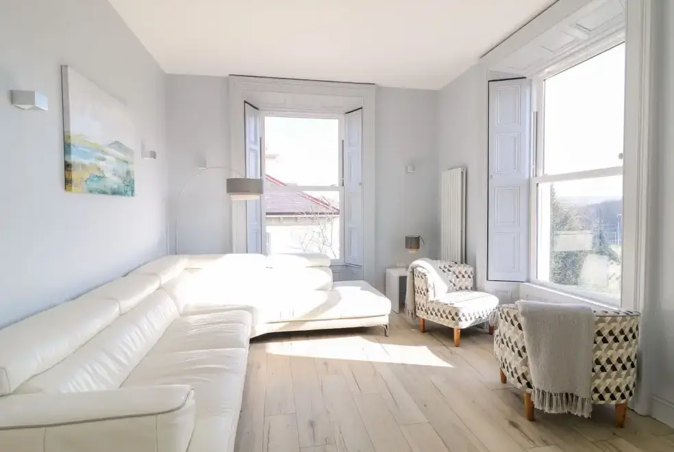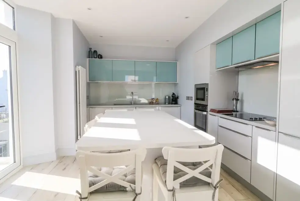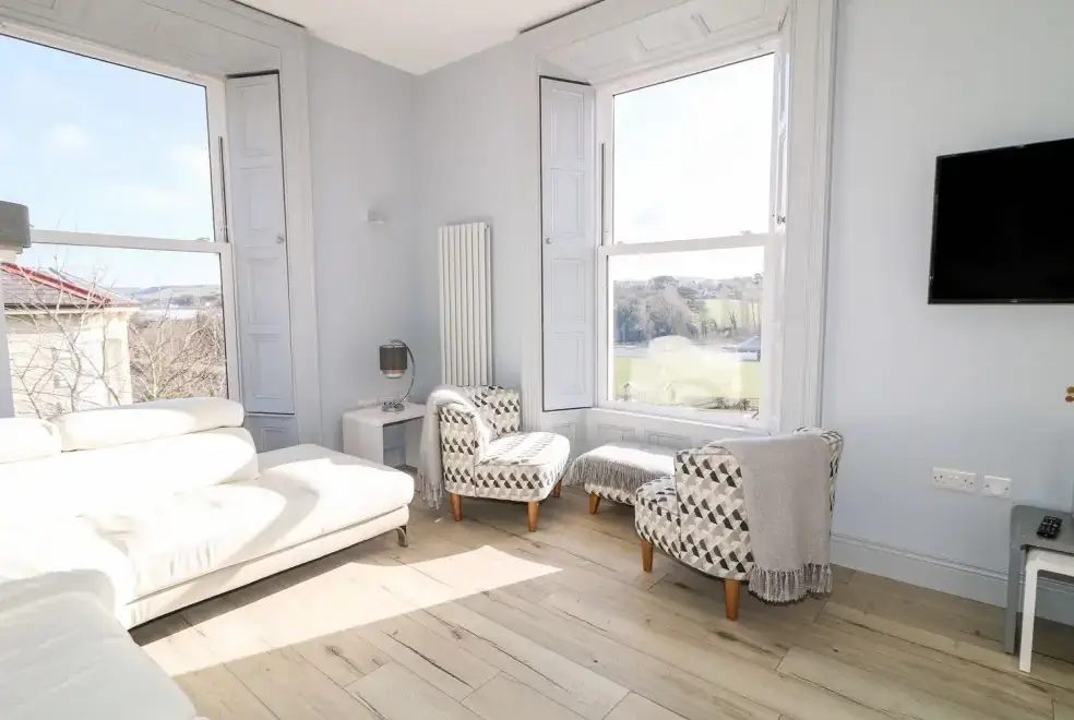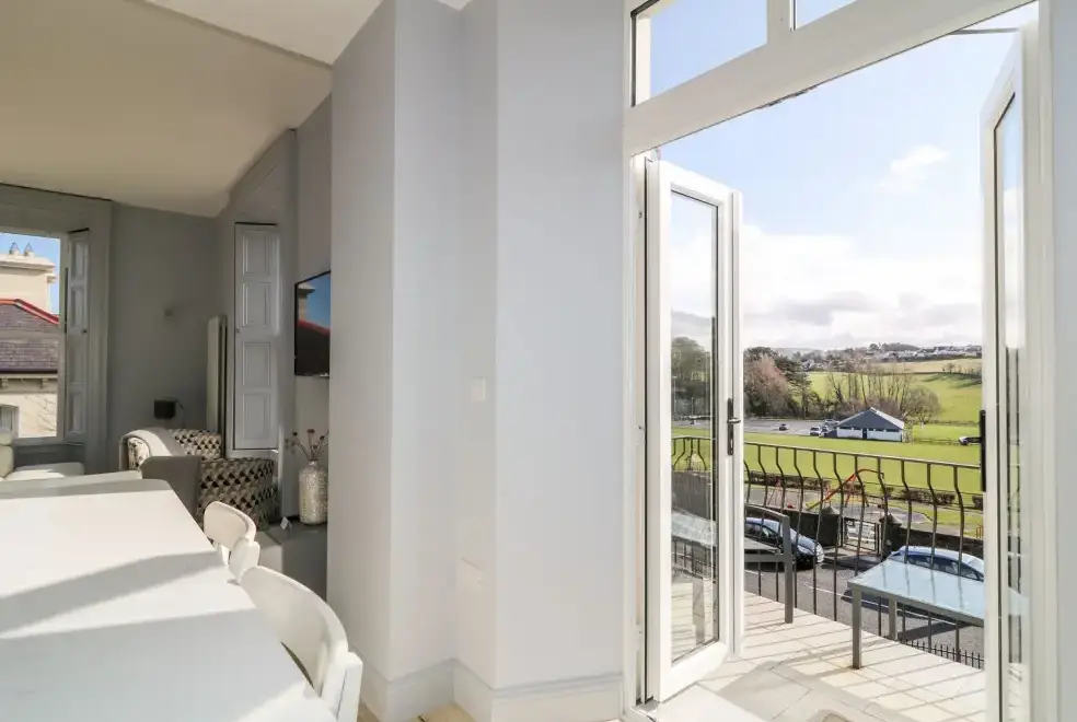 Overlooking the stunning Causeway Coast, Sea Breeze in Ballycastle offers a luxurious retreat with magnificent sea views. Upon entering the first-floor apartment, guests are welcomed into an airy open-plan living area, beautifully illuminated by natural light through large patio doors leading to a splendid balcony. Relax on plush white leather sofas or stylish armchairs and enjoy the panoramic seascapes. The chic high-gloss kitchen is equipped with modern appliances, perfect for preparing delightful home-cooked meals. With a kitchen island serving as the social hub, guests can enjoy a glass of bubbly on the balcony while taking in the serene coastal ambiance.