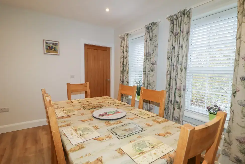 The fully equipped kitchen boasts a gas oven, hob, microwave, kettle, toaster, and fridge/freezer, ensuring you have everything you need for meal preparations. Enjoy the comfort of central heating indoors in the delightful dining room and a spacious sitting room, making Sliabh Amharc a perfect home away from home. The property also offers a ground-floor bathroom with a bath, walk-in shower, basin, and WC for additional convenience.