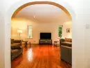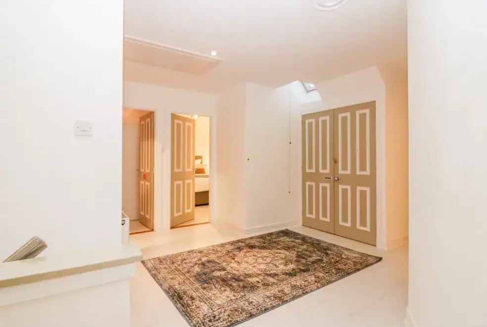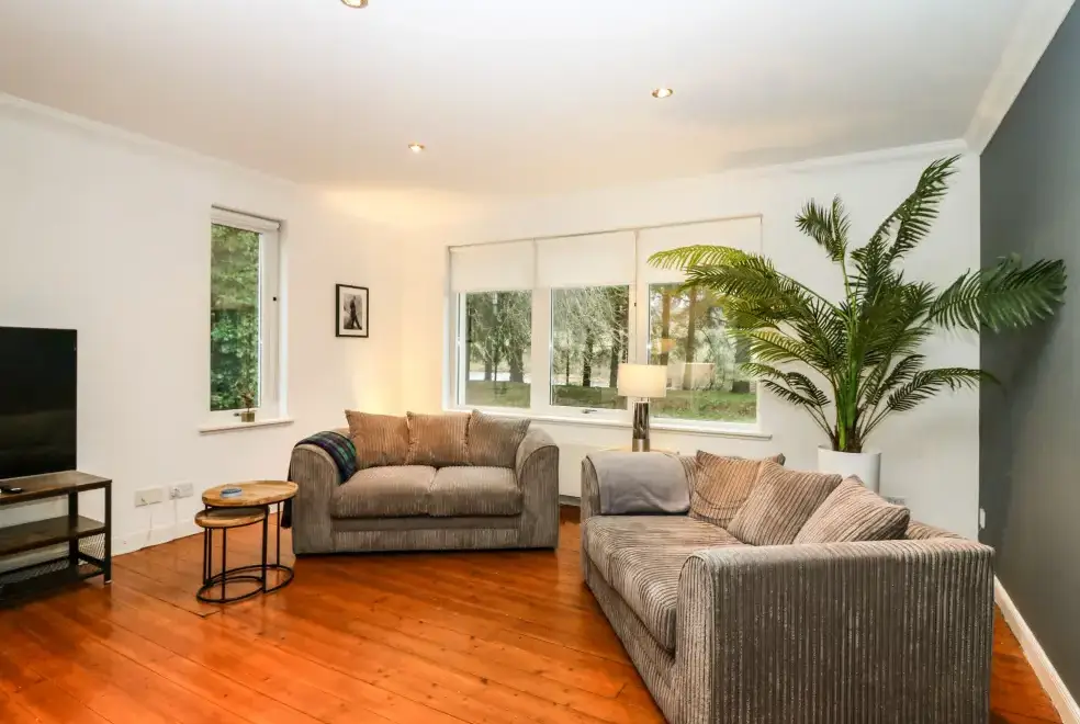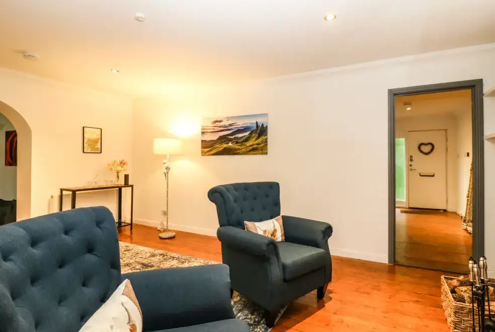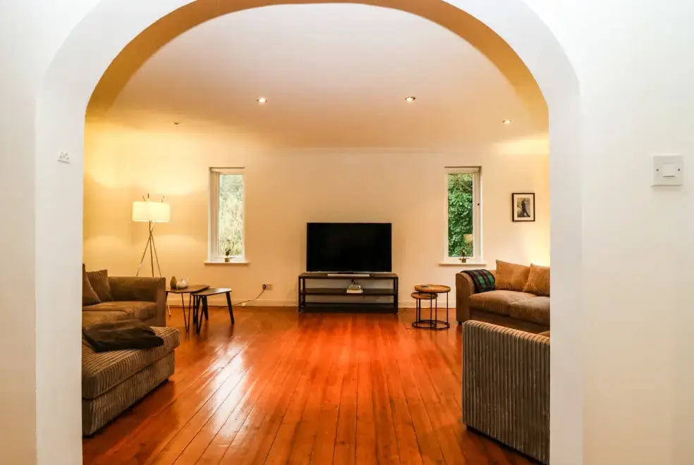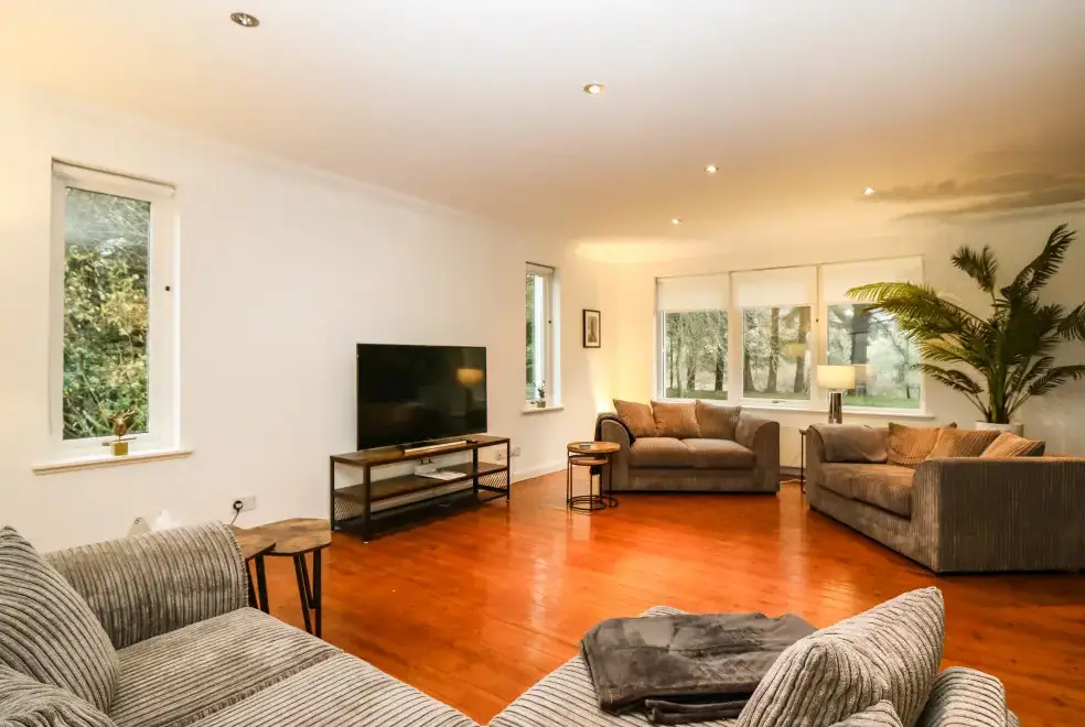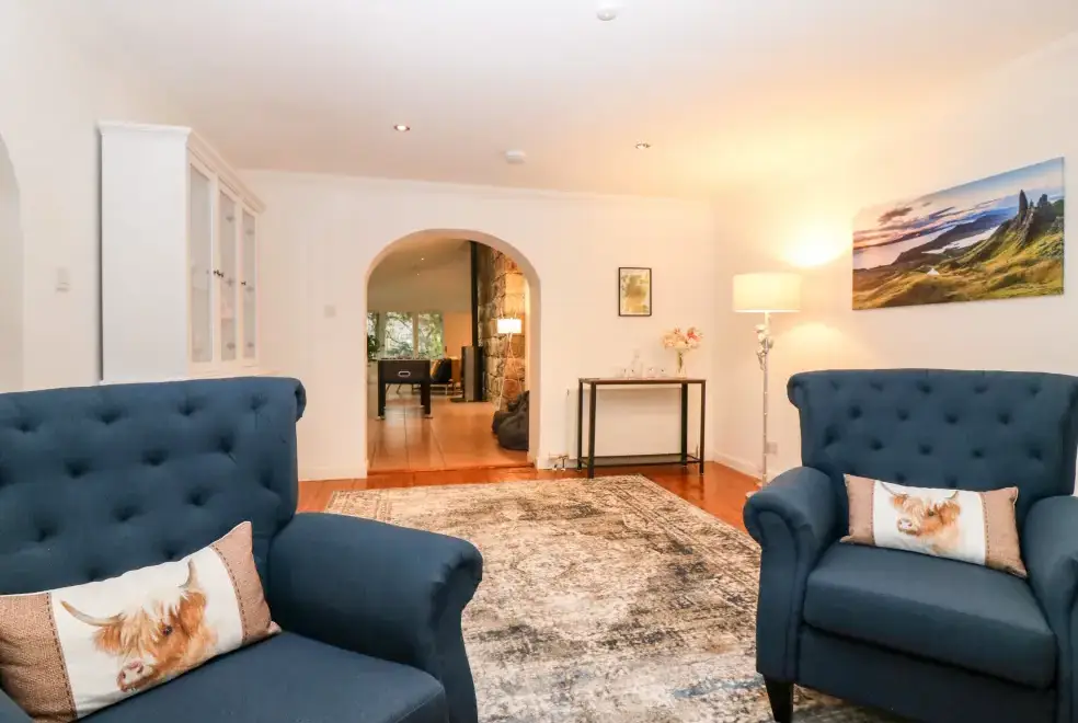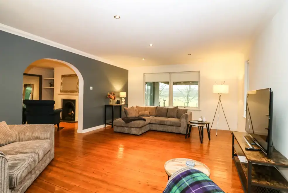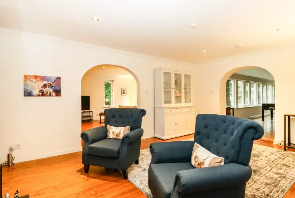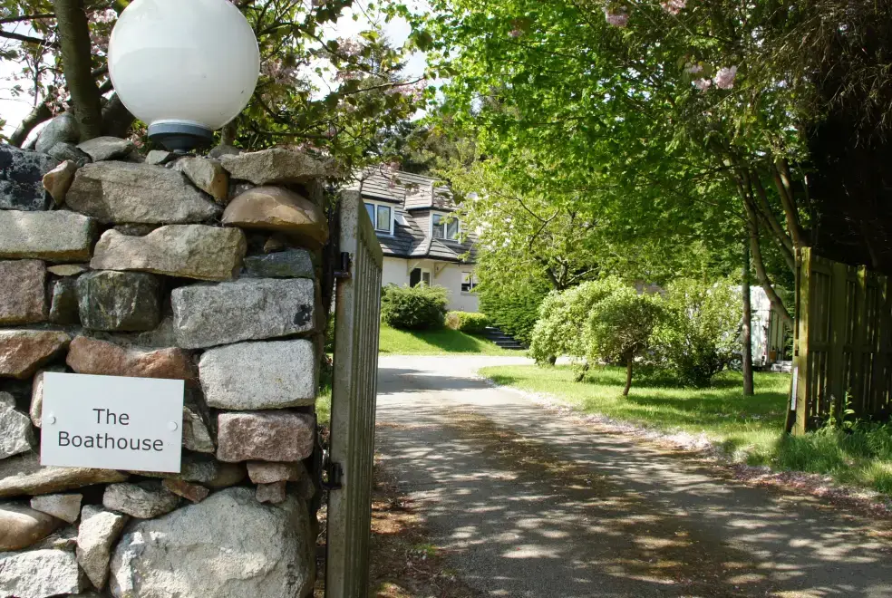 The Boat House, south west of the city of Aberdeen, is in the up-market district of Peterculter. The build is of granite as are most detached properties in the area. A long driveway leads to the house which stands enclosed by a granite wall. It’s a large house with 5 bedrooms and 5 bathrooms, perfect for a large family or group of nine friends. The gardens of the property lead down to the River Dee which arises in the Cairngorms and flows through stunning Scottish landscapes out to the sea at Aberdeen.The accommodation is superb. Open arches have replaced doorways and allow views from one room to another downstairs. There is a feeling of open-plan spaciousness without actually being that. Polished wooden floors and neutral walls assist the feeling of flow from room to room, each is of a very high standard and stylishly furnished.