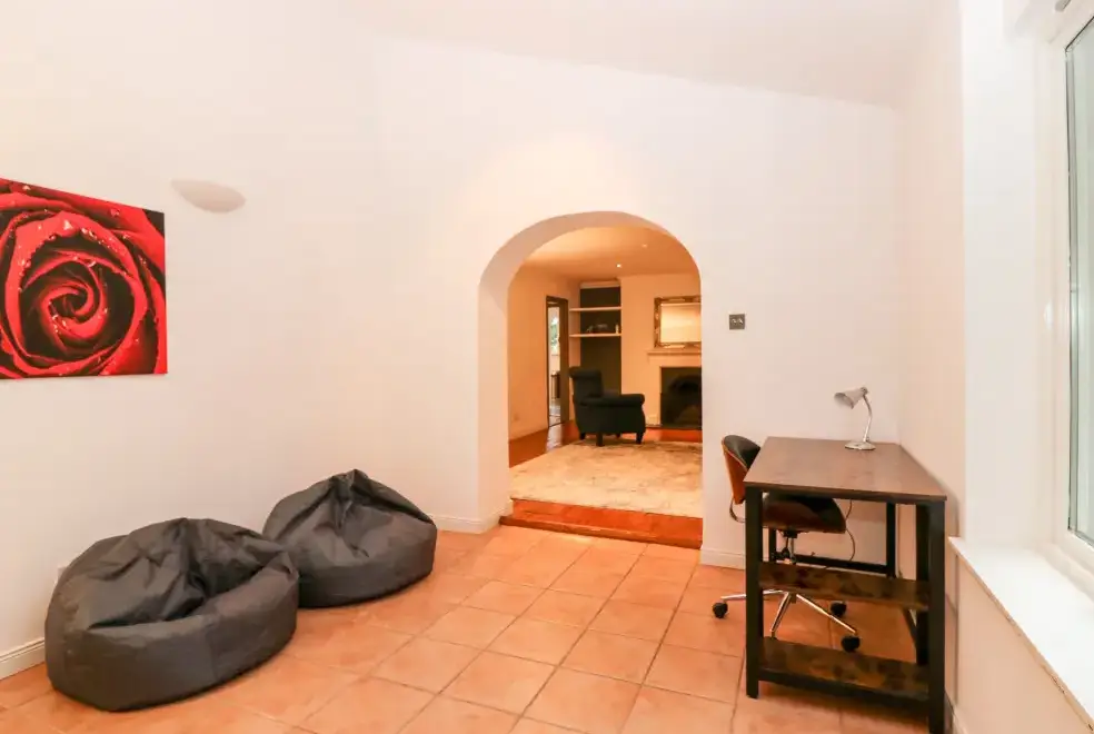 The main sitting room is huge. Large comfy sofas are spread out around the room facing the T.V. Another smaller sitting room is more formally furnished with upright button backed upholstered chairs and sofas, then the third living area is a sun room with a woodburner, table football, big bean bag seats on the floor and sun loungers. This is definitely the chill out area.