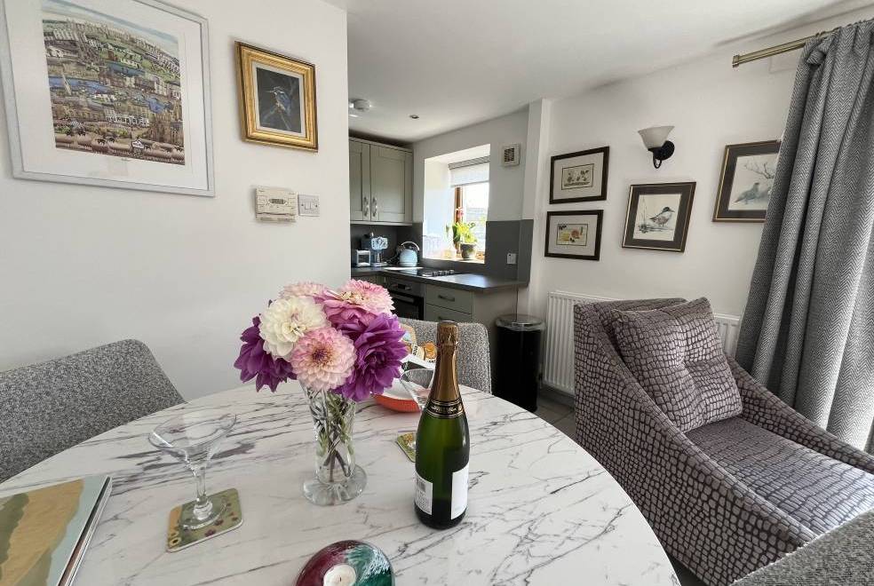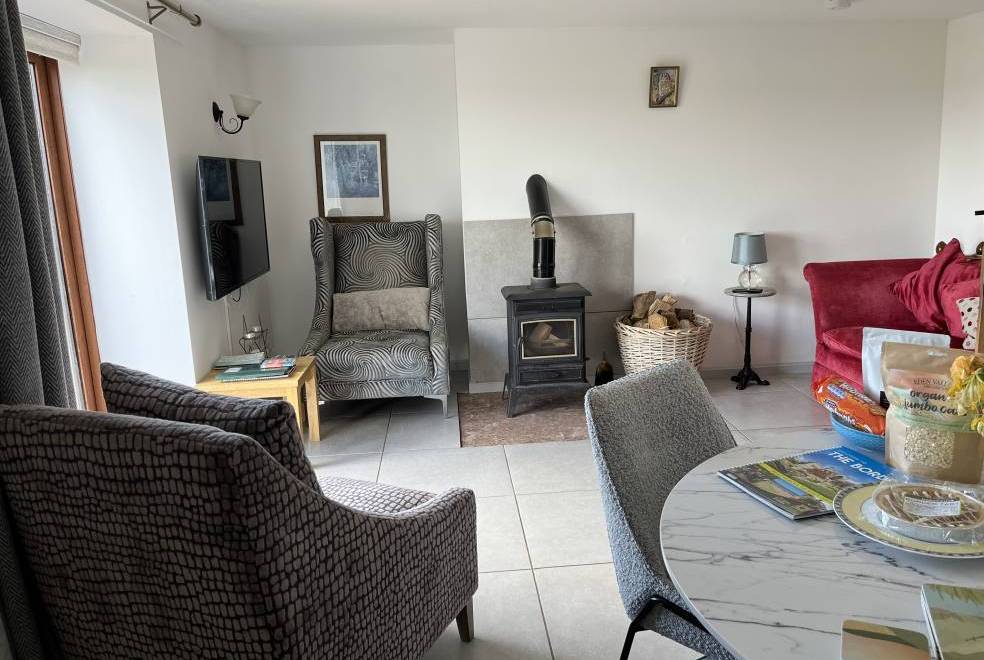 • Open plan living area with south facing lounge area with smart TV, a warming woodburner, a dining area, a well equipped small kitchen and French windows to maximise on the views, and a door which leads out to the patio where you can dine alfresco or enjoy evening drinks whilst taking in the stunning view over the Tweed Valley and the Cheviots Hills on the horizon.• There is a king size bedroom with a luxurious en-suite shower room,