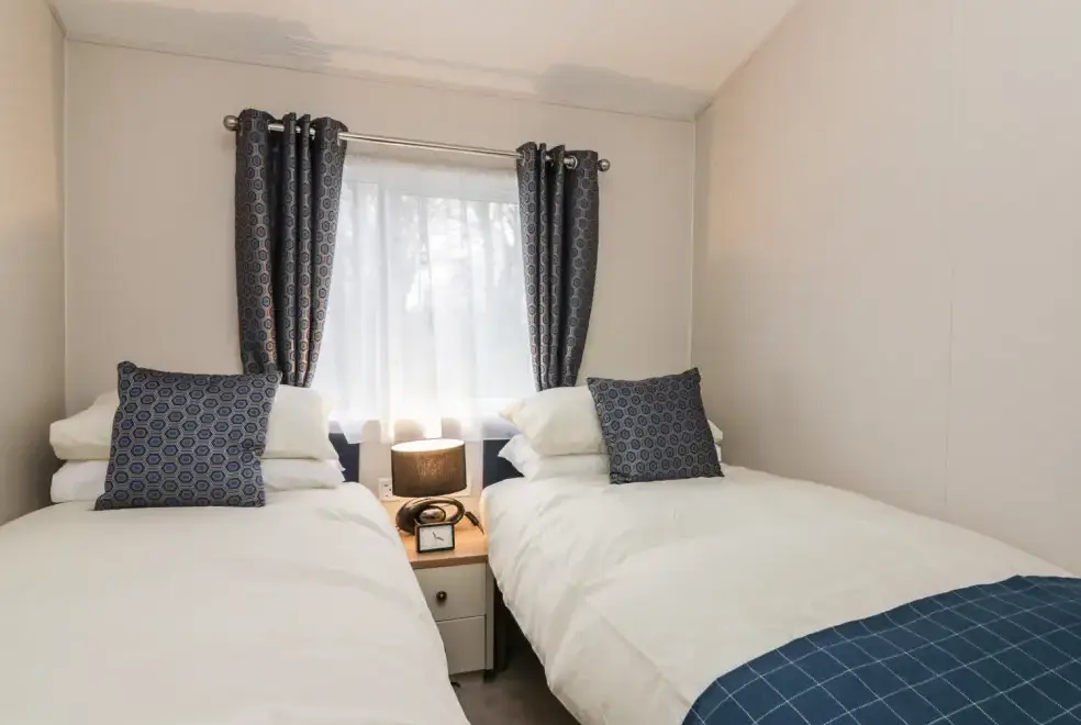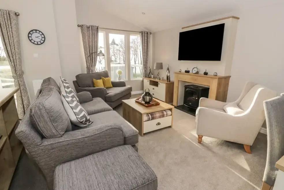 Woodstock Lodge is a hidden gem within the quiet and exclusive area of Wemyss Bay Holiday Park on the Inverclyde coast. From the moment you arrive, the tastefully furnished interior will captivate you. The entrance through the utility room leads to an immaculate open-plan living area. The space boasts a luxurious lounge with seating for six, a large kitchen, and a dining area, all equipped with modern facilities. Guests can enjoy the beautiful views, relax by the electric fire, or listen to music via Bluetooth speakers. A large patio door opens onto an enclosed deck, ideal for alfresco dining. Each of the three bedrooms is fitted with a television and integrated DVD player, adding to the comfort of your stay.