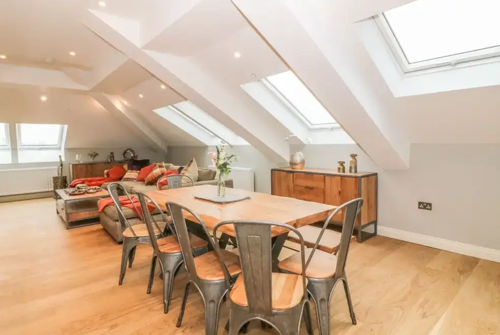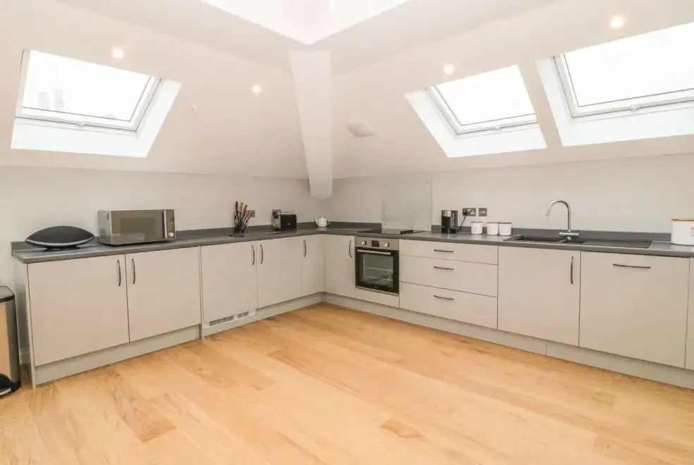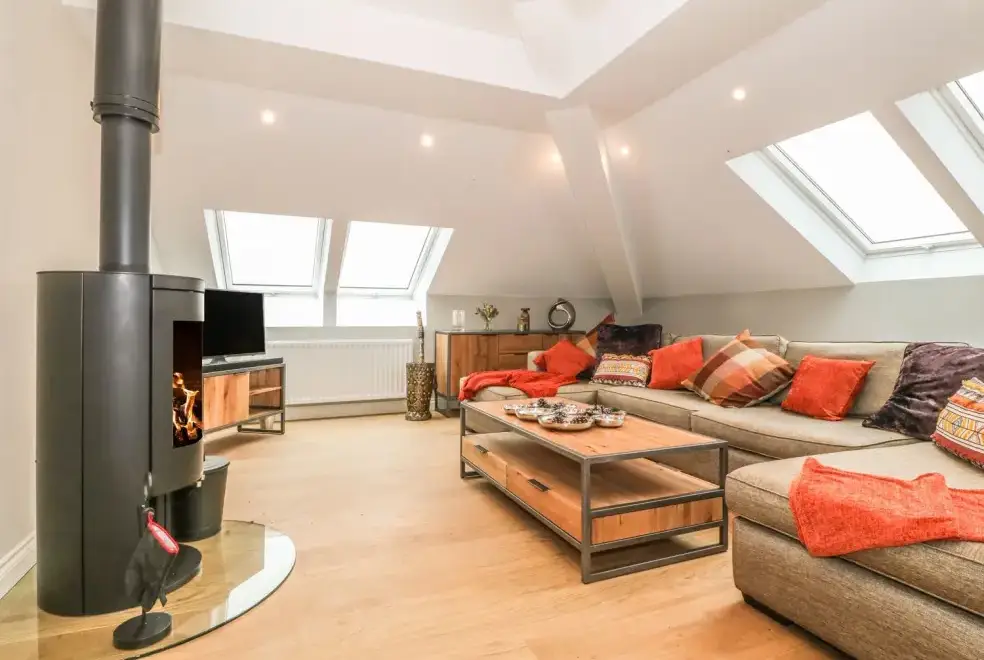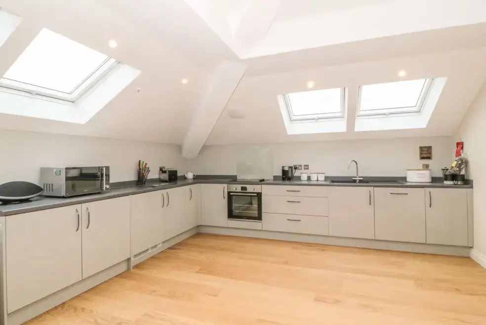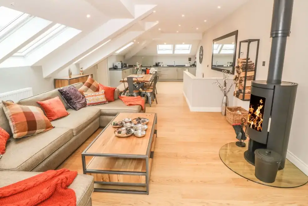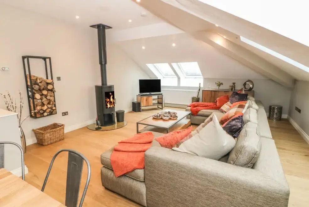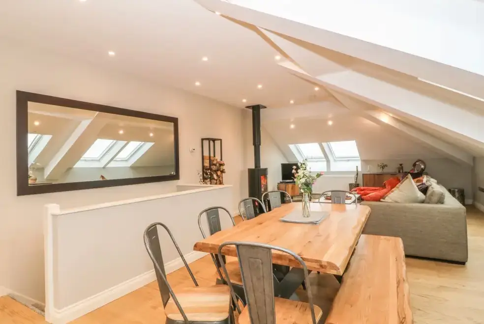 The open-plan living area on the second floor of Sardis Chapel 1 provides a luxurious space for relaxation and entertainment. With a large U-shaped sofa, a multi-fuel stove, and views over the magnificent Yr Wyddfa (Snowdonia), you can enjoy cosy evenings tucked away from the chill. The dining area seats eight, allowing families to enjoy meals prepared in the high-quality fitted kitchen, complete with contemporary appliances.