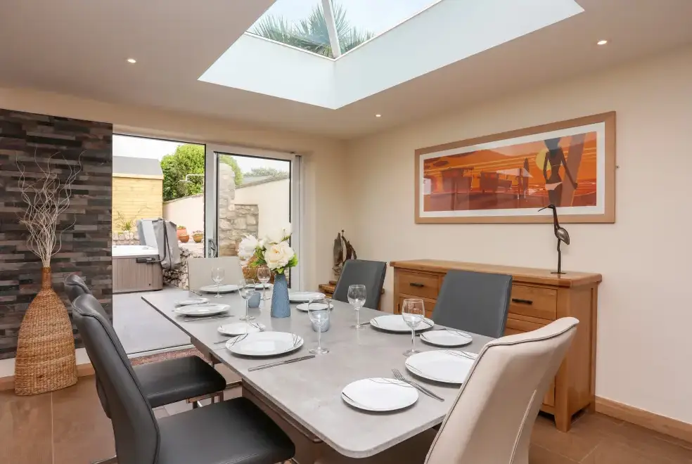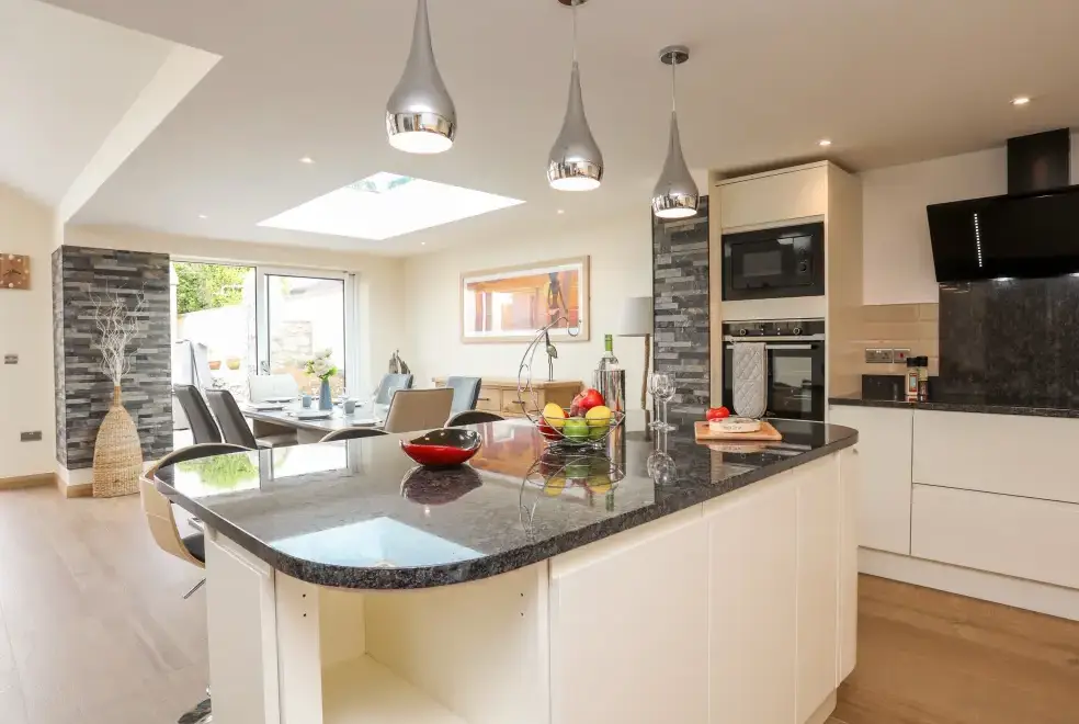 Park up on the private driveway and step inside to find an impressive open-plan living space, ideal for hosting celebrations. Enjoy a drink at the dining table under a skylight, with patio doors inviting the fresh coastal breeze. The well-equipped kitchen has everything needed for a week-long stay, including an air fryer and coffee machine, perfect for preparing family meals or picnics. Unwind in front of the woodburning stove with a family-favourite film on the Smart TV.