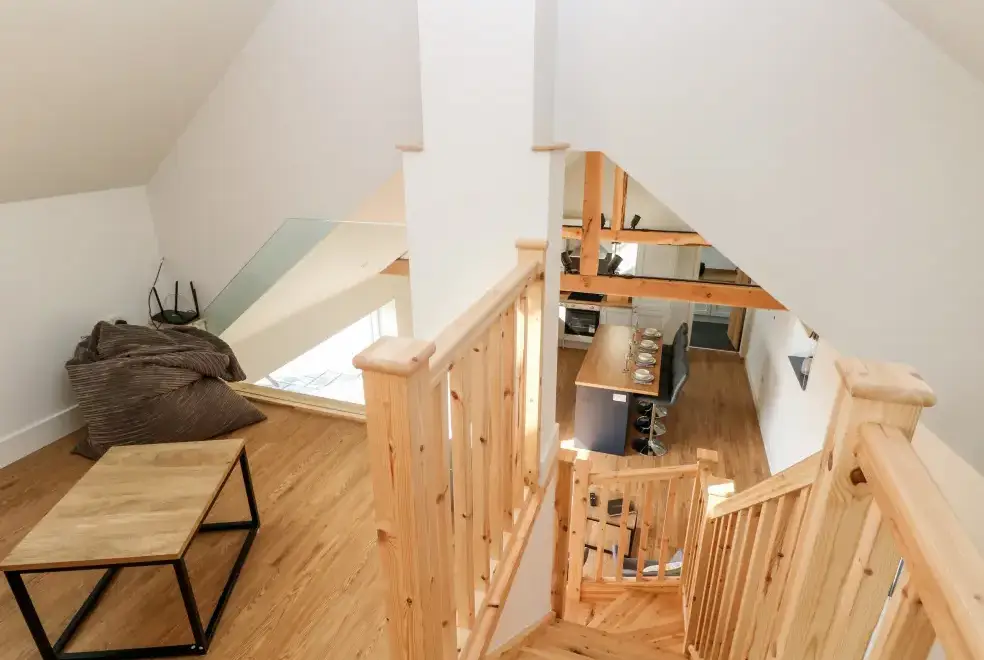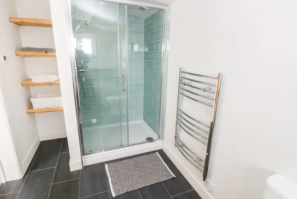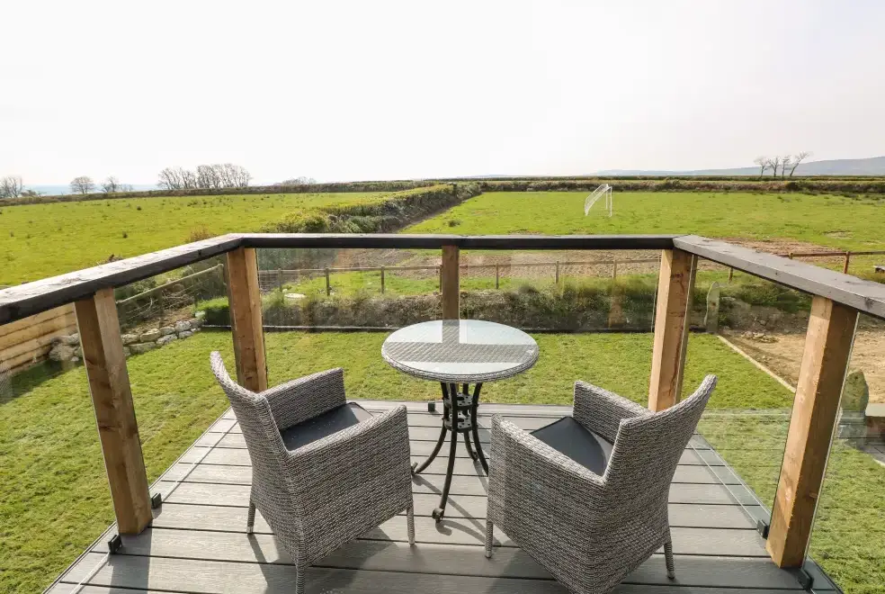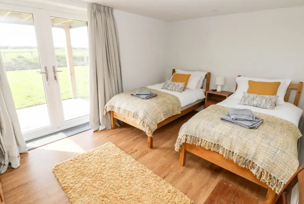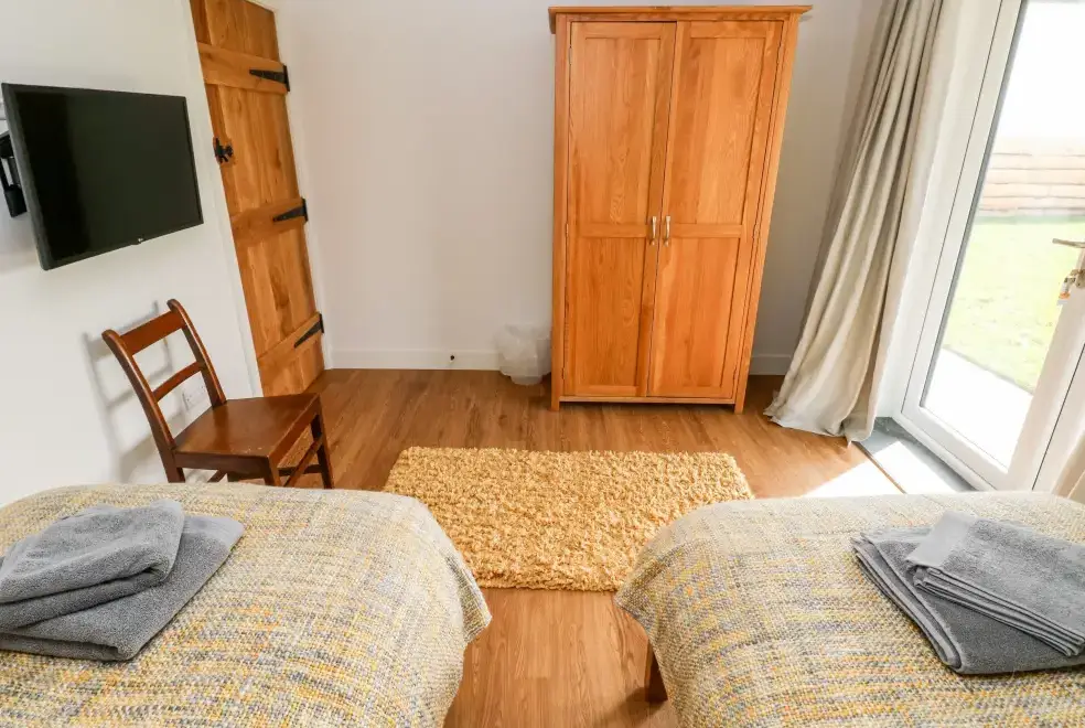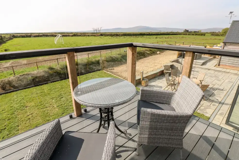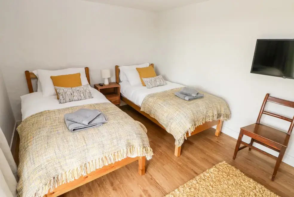 Glowty Brynbedw offers exquisite living areas, featuring an open-plan kitchen/diner equipped with an electric oven and hob, microwave, fridge/freezer, dishwasher, TV, and a charming woodburning stove. The mezzanine sitting room boasts a balcony and TV, while a utility room with a washing machine adds convenience. Two bedrooms are located on the ground floor: a king-size with TV and en-suite bathroom featuring a bath and shower, and a twin with TV, accompanied by a main bathroom.