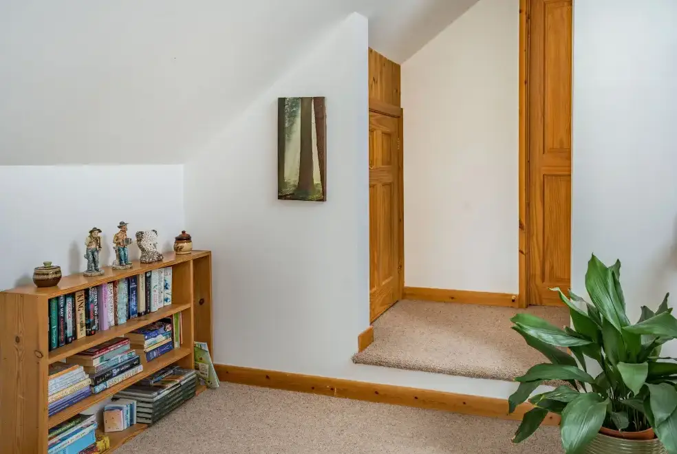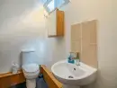 Upstairs are two generous bedrooms, one double and one twin. These share a WC with a wash-hand basin. Both bedrooms have sloping ceilings under the eaves.