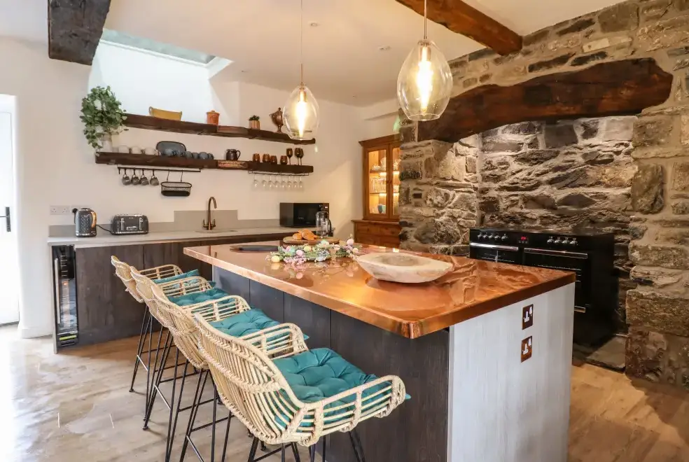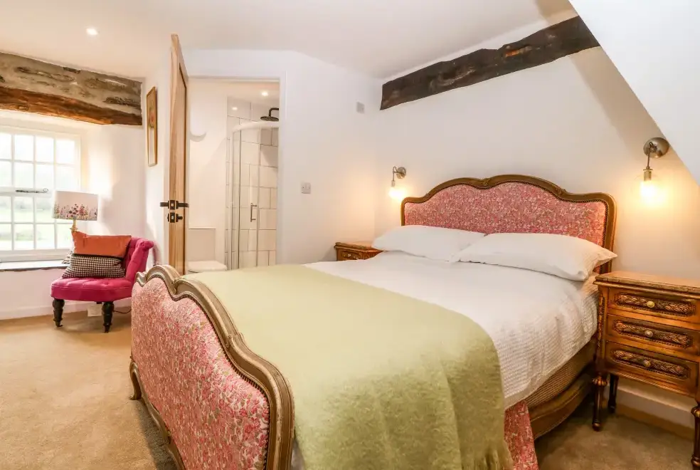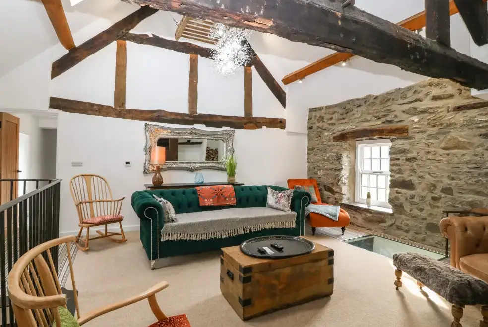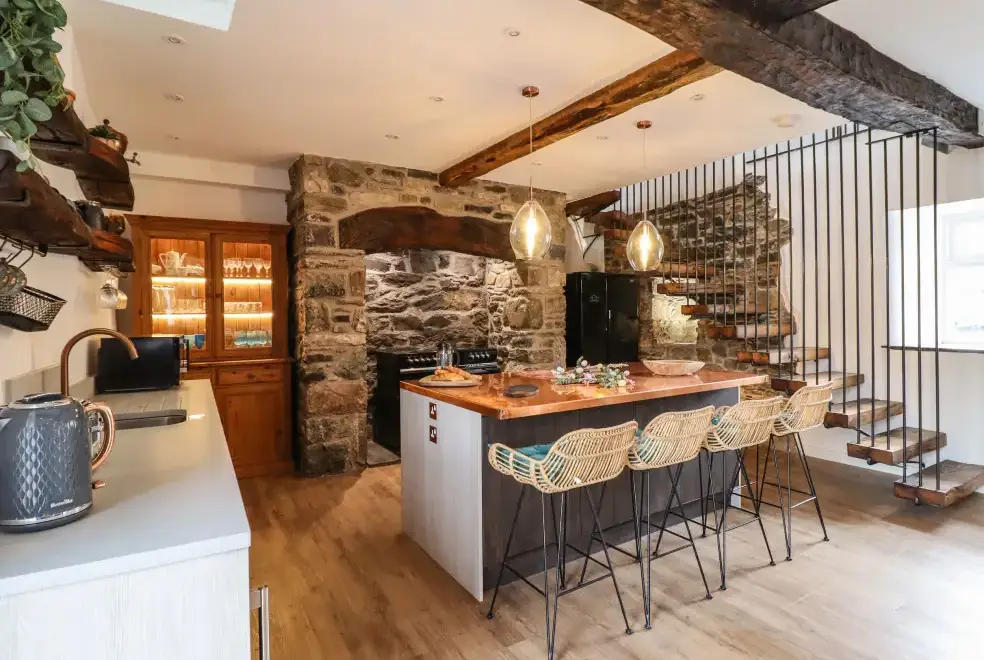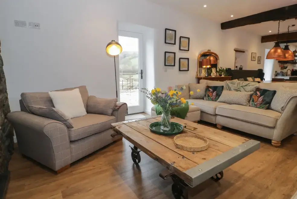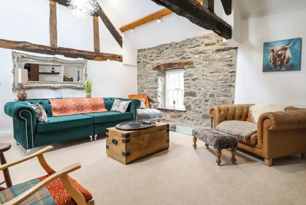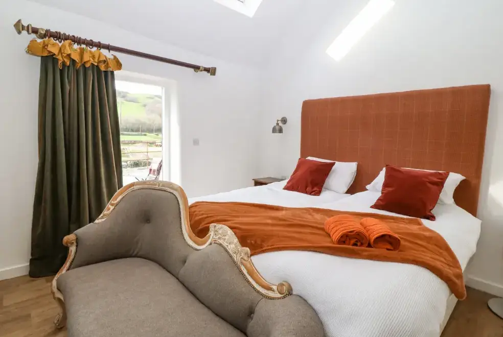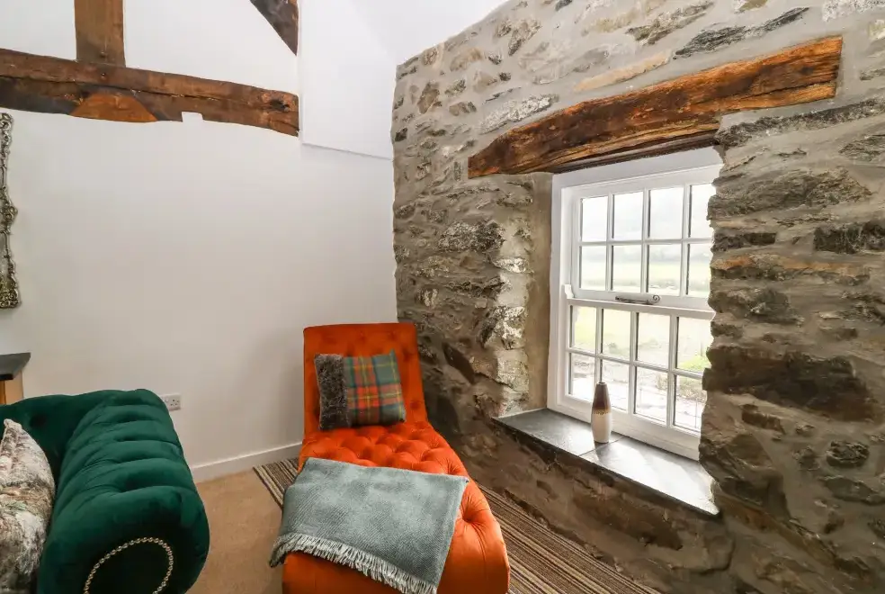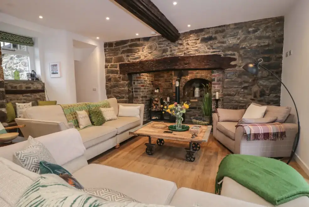 Set on a working farm, Plas Glan Yr Afon is a 16th-century Grade II listed building that beautifully blends historic charm with contemporary comforts. Highlights include an inglenook fireplace and original timber features. The open-plan living space, with its copper worktop island and pew-seat dining table, is perfect for family gatherings. Bedrooms are tastefully decorated, each with unique features like reupholstered French beds and stone sinks. The property’s garden and river views add to its serene appeal.
