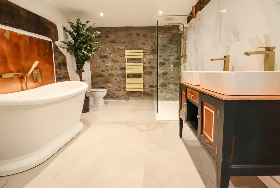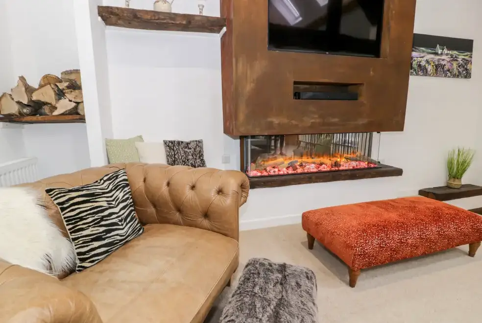 Experience unparalleled luxury over three floors at Plas Glan Yr Afon, a five-bedroom property nestled in Llangernyw, North Wales. The ground floor features a super-king-size zip/link room with an en-suite, while a king-size and a double room also offer en-suite shower rooms. On the second floor, discover a double and a twin room alongside a spacious bathroom. The open-plan living area includes a fully-equipped kitchen, a dining space, and a cosy sitting area with a woodburning stove. Additionally, there's a first-floor sitting room with an electric fire, perfect for relaxing evenings.