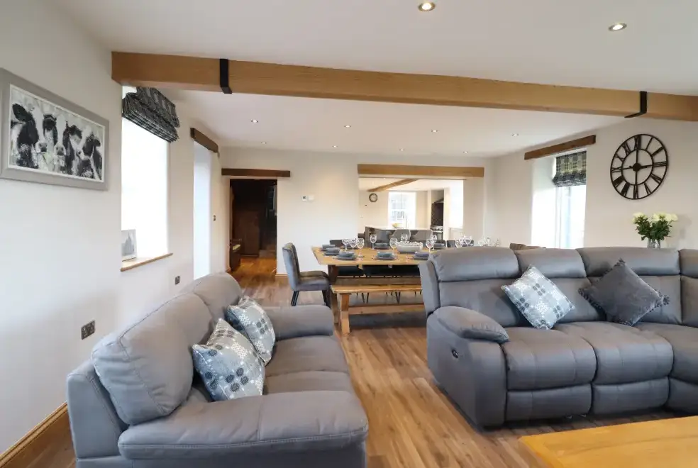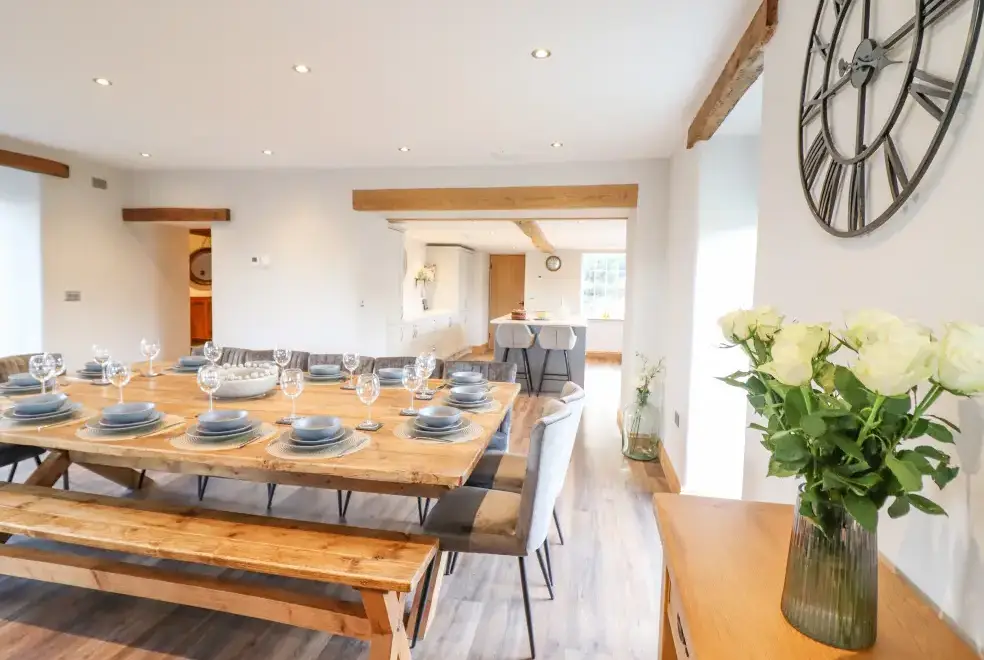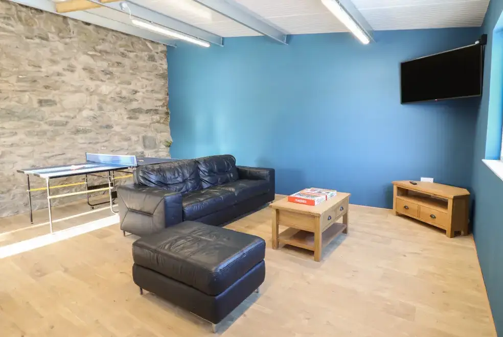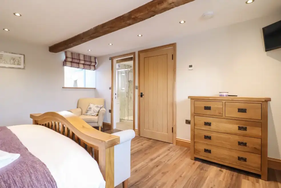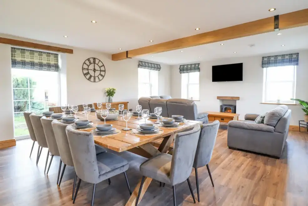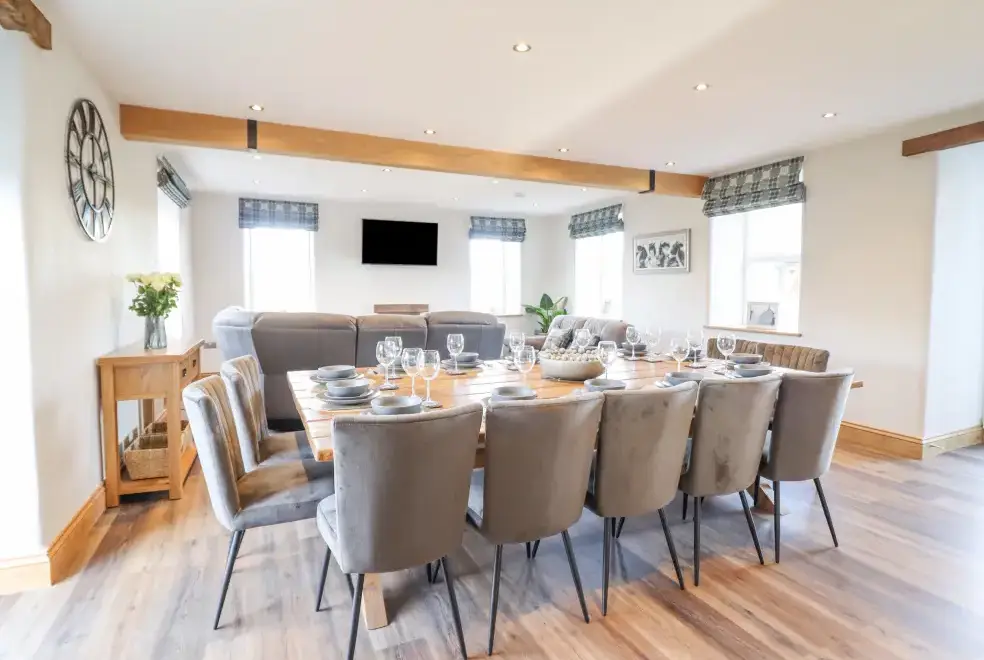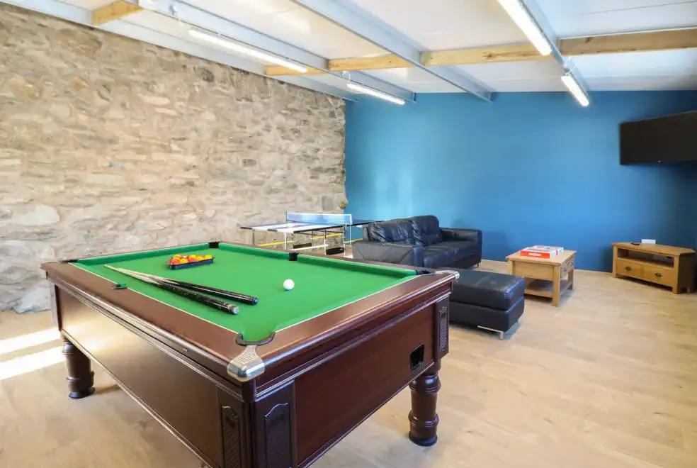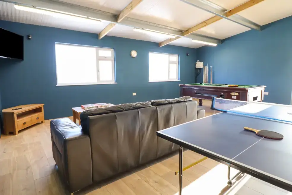 Farmhouse offers a luxurious open-plan living area complete with a modern kitchen, dining, and sitting area equipped with an electric Rangemaster oven, hob, microwave, dual fridge/freezer, dishwasher, and Smart TV. Enjoy the warmth of a woodburning stove or relax in the separate sitting room, both featuring Smart TVs. Additional amenities include an external utility room with a washing machine and tumble dryer, and an external games room with a pool table. A convenient cloakroom is also available.