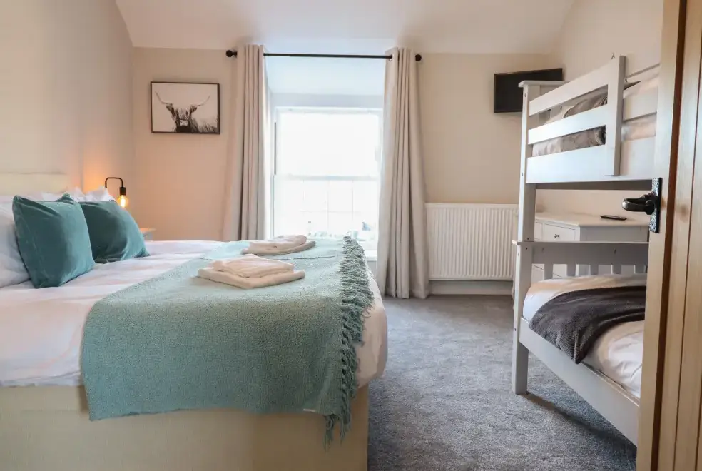 This property boasts six bedrooms, all with Smart TVs, and four with en-suite shower rooms. The accommodation includes a super-king-size room, a king-size, a ground-floor king-size, two doubles, and a family room with a super-king-size and bunk beds. A modern bathroom features a free-standing bath and walk-in shower. This pet-free, smoke-free property ensures a comfortable stay with WiFi, fuel, power, bed linen, and towels included.