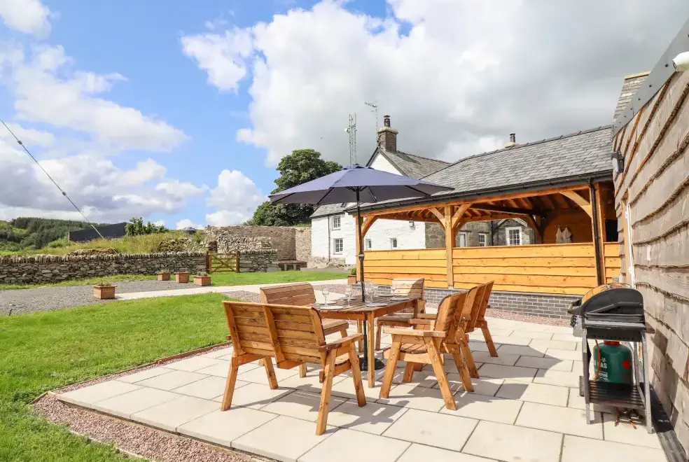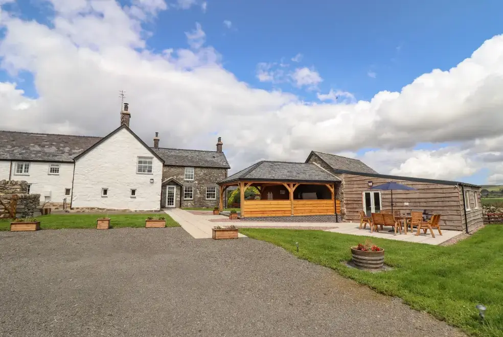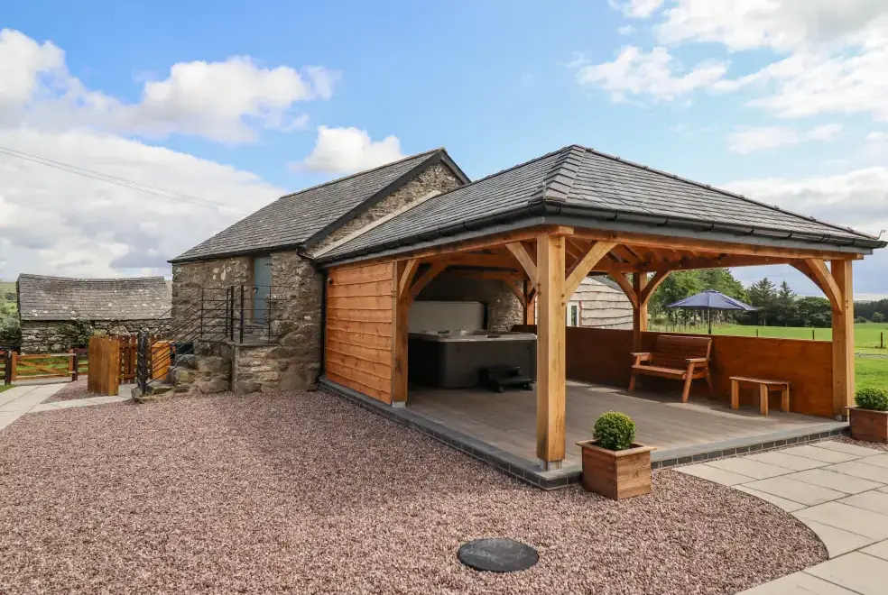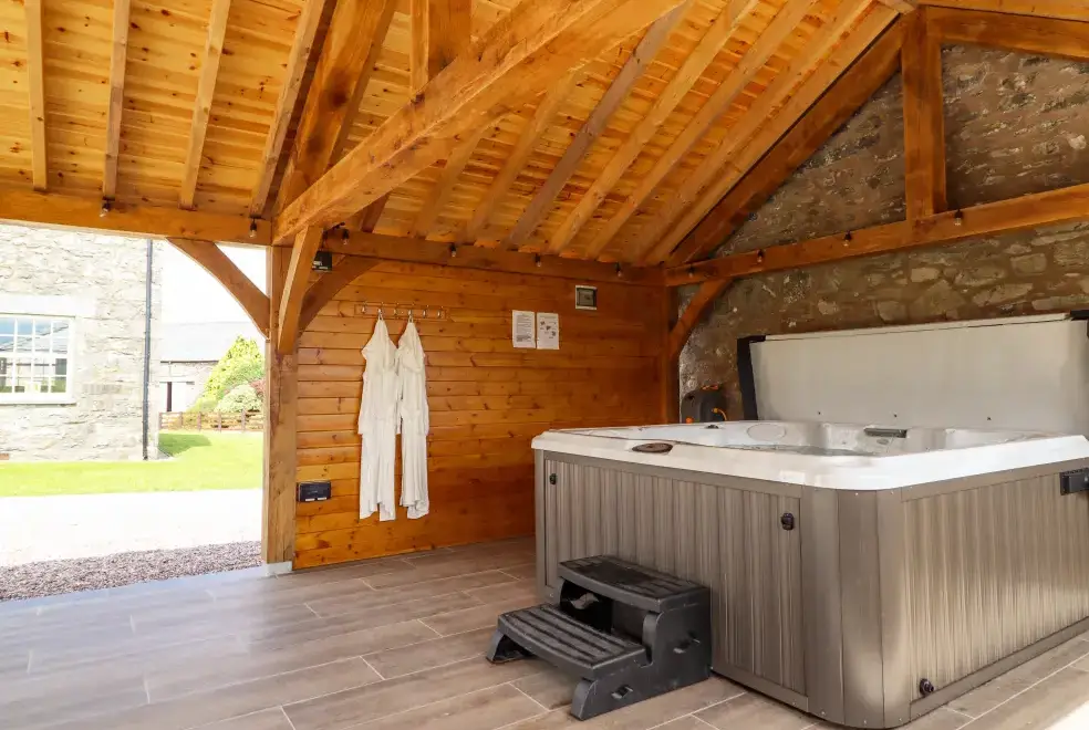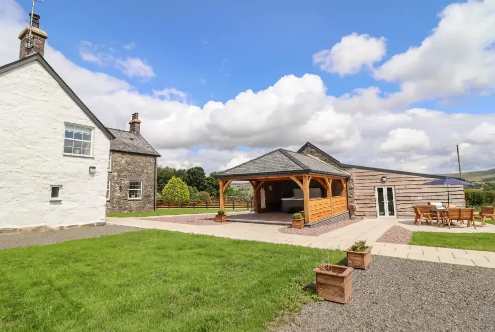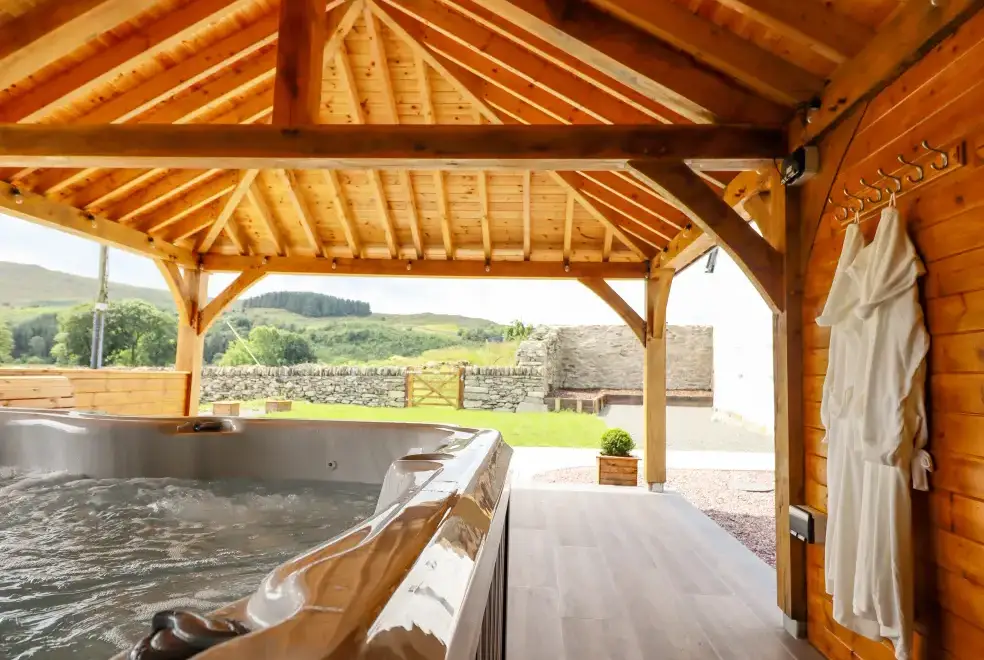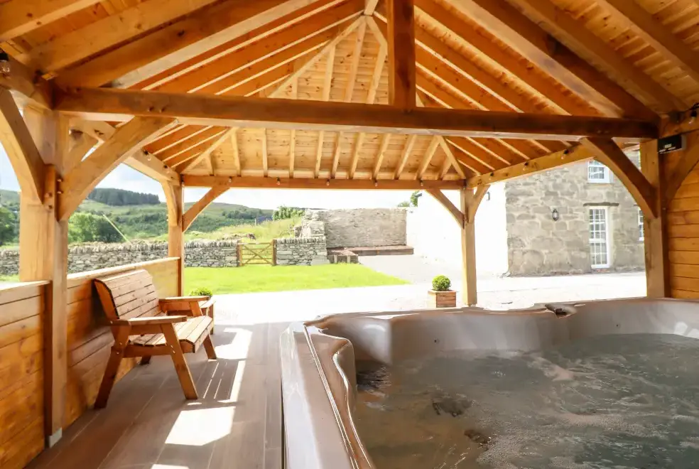 Farmhouse features a wrap-around garden with a lawn, patio, furniture, and a hot tub, ideal for alfresco dining or soaking in the bubbling hot tub. Located on the owner's working farm near Betws-y-Coed, the property offers stunning views of Snowdonia National Park. Nearby attractions include the Hiraethog Trail, Llyn Brenig, Alwen Reservoir, and activities like hiking, kayaking, and mountain biking. Explore local gems such as Conwy Falls, The Fairy Glen, and Swallow Falls.