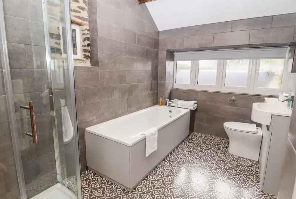Cut Moch is a charming detached holiday cottage located in Moelfre, Powys, near Llanrhaeadr-ym-Mochnant. This all-ground-floor retreat features two well-appointed bedrooms: one super king-size (zip/link, convertible to twin on request) with an en-suite shower room, and a twin bedroom (zip/link, convertible to king-size on request) with an en-suite bathroom. The open-plan living area includes a kitchen, dining area, and cosy living space with a woodburning stove, perfect for relaxing after a day exploring the beautiful Welsh countryside.