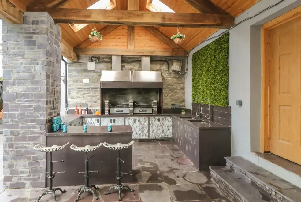 On the first floor, Bryn Derwen hosts four beautifully presented super king-size bedrooms, two of which feature en-suite bathrooms. Each room promises a restful night's sleep, with tranquil decor and ample space. A family room with two double beds and another with triple bunks offers comfortable accommodation for children or additional guests. The stunning family bathroom boasts a Jacuzzi and exposed beams, providing a luxurious bathing experience. The gallery-style lounge, overlooking the kitchen, is a signature feature of the cottage, complete with a games console for entertainment. This inviting space ensures that all guests feel at home during their stay.