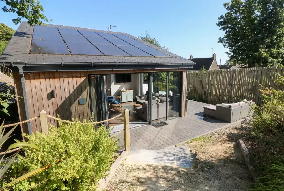 The cabin features a fully equipped kitchen, complete with an electric oven, induction hob, microwave, fridge/freezer, washer/dryer, dishwasher, and waste disposal sink. Enjoy home-cooked meals at the dining table for four or al fresco on the deck during sunny days. Rest comfortably in the two bedrooms: a king-size with an en-suite walk-in shower, and a twin room that can be converted to a super-king-size upon request. An additional shower room ensures convenience for all guests.