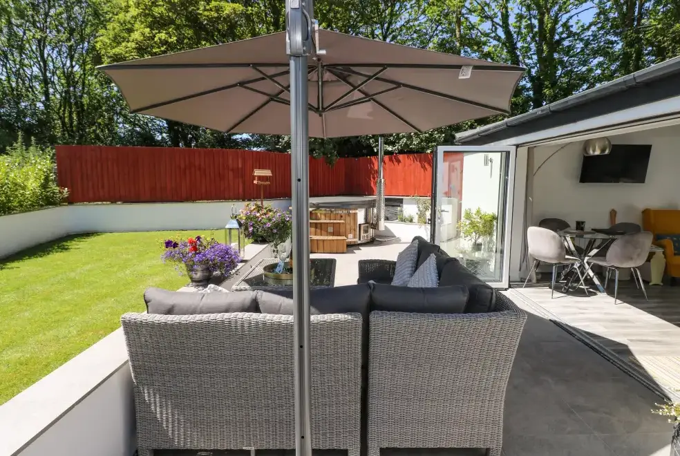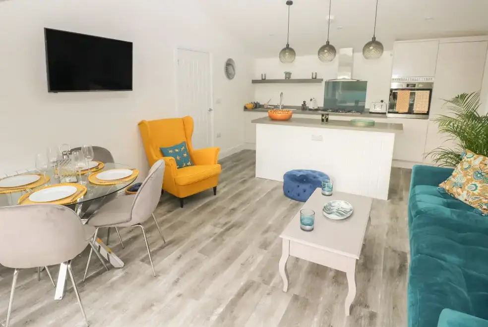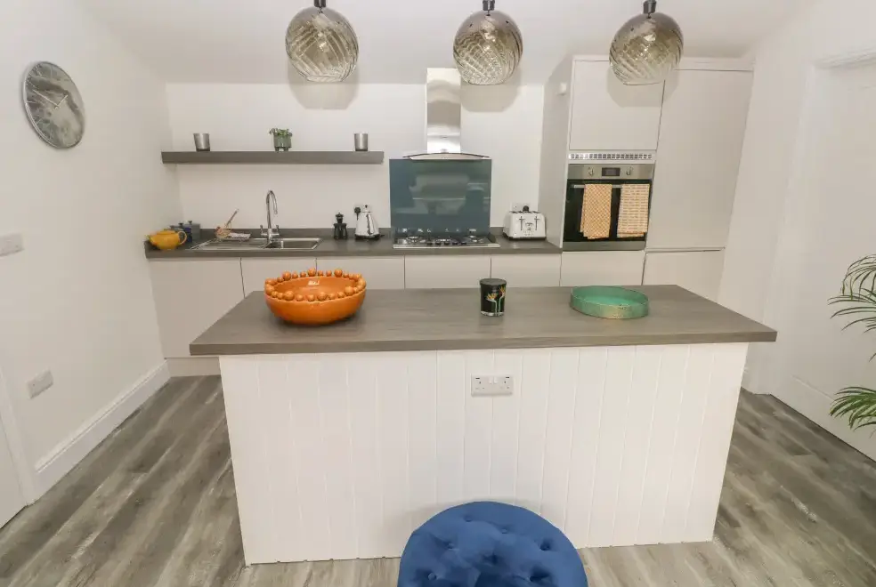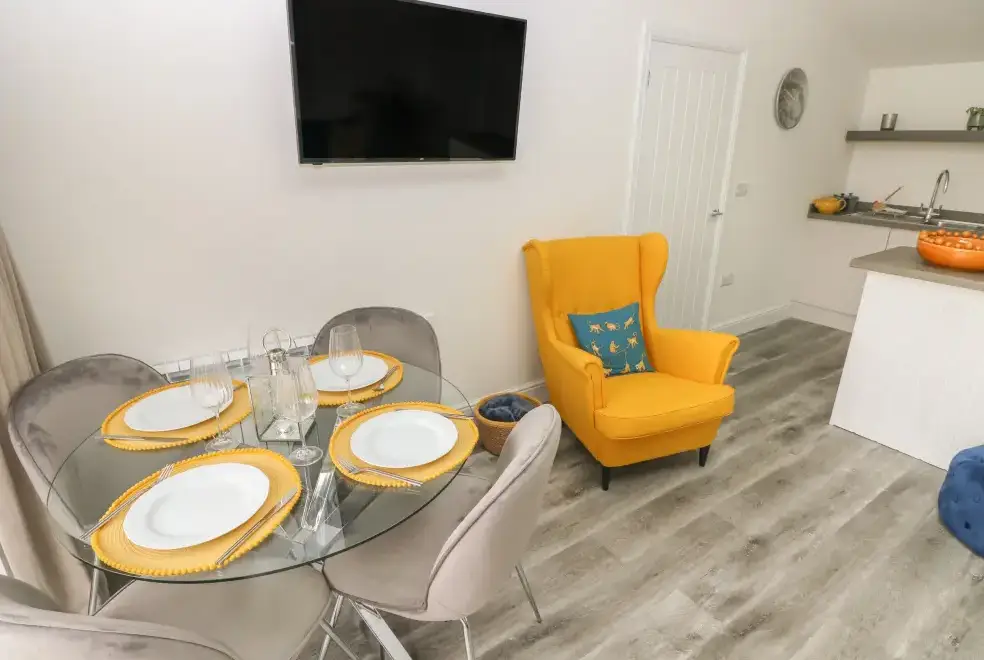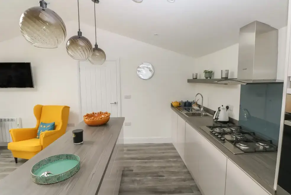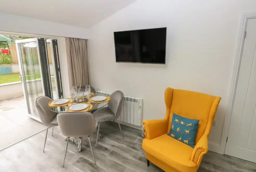 Nestled in an idyllic location to discover the stunning Welsh coast, Summer House is a stylish all-ground-floor property that offers contemporary interiors and a delightful outdoor space. Situated on the grounds of the owner's home in the scattered village of Penally, this property ensures a memorable stay for all guests. The bi-fold doors flood the space with natural light, creating a bright and airy atmosphere. Guests can relax on the plush blue sofa or the inviting mustard armchair, and enjoy preparing meals in the well-appointed kitchen. The kitchen is equipped with an electric oven, gas hob, fridge, dishwasher, and washer/dryer, providing everything needed for a self-catered stay.