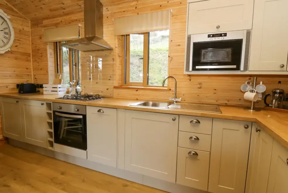Set in an idyllic elevation, The Firs overlooks the breathtaking scenery of Powys in Wales, just three miles west of the charming town of Llanidloes. This wooden-clad lodge is perfectly placed for exploring the Welsh outdoors, making it an ideal base for adventure or a peaceful retreat. Upon entering The Firs, guests are welcomed by a spacious, bright, and airy open-plan living area, complete with a TV and an electric flame-effect fire. The dining table seats four, and the modern kitchen is fully equipped for convenience during your stay.