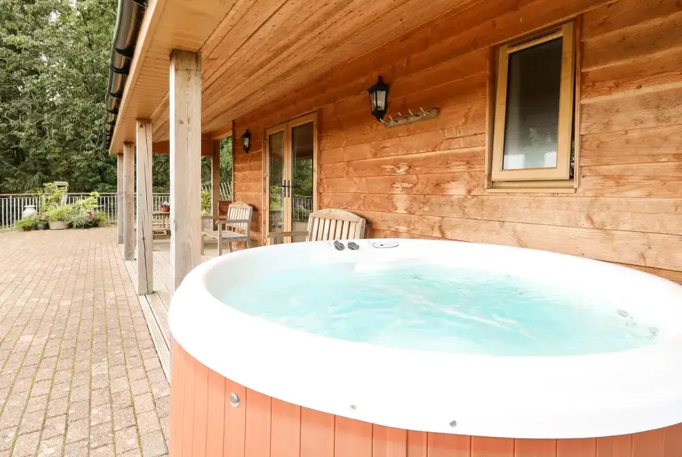 The Firs is a luxury wooden lodge located just three miles from Llanidloes in Powys, Wales. This exquisite property boasts two bedrooms, each with double beds and en-suite facilities, accommodating up to four guests comfortably. The open-plan living area is a highlight, featuring a kitchen, dining space, and a sitting area with a woodburning stove. The lodge is equipped with LPG heating and an electric flame-effect stove, alongside modern conveniences such as an electric oven, gas hob, microwave, fridge, freezer, washing machine, dishwasher, TV, and WiFi. Guests can also enjoy a luxurious hot tub, with fuel, power, and a starter pack included in the rent.