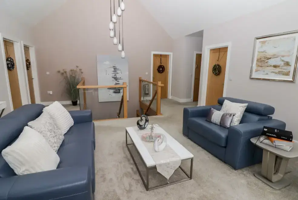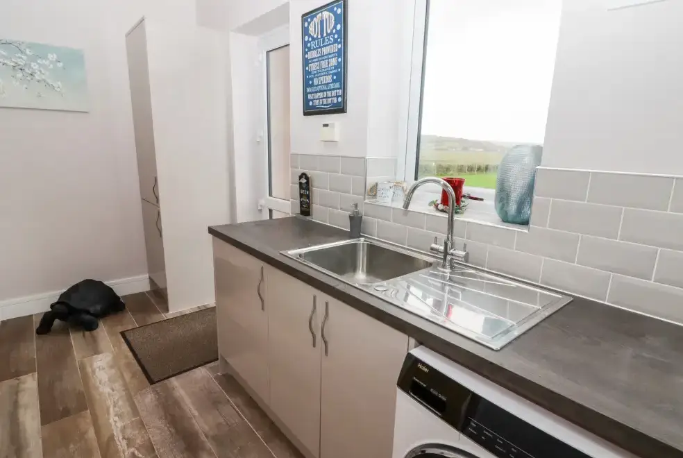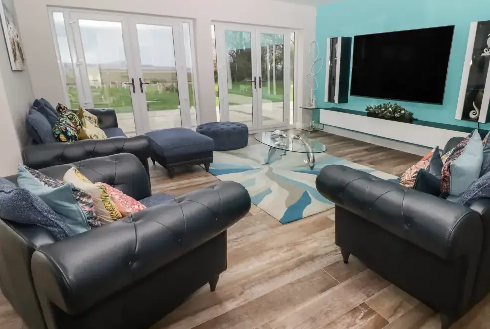 Experience the ultimate in comfort with Ty Marlyn's open-plan living areas, featuring a modern kitchen, dining, and sitting area, a snug, a study, and a first-floor sitting room. The property also boasts an external games room. Bedrooms include a twin, a double, two king-size rooms, one with a balcony and en-suite. Guests can enjoy three additional shower rooms. High-end appliances like a double electric oven, induction hob, and dishwasher are included, complemented by entertainment options such as two Smart TVs and a selection of games.